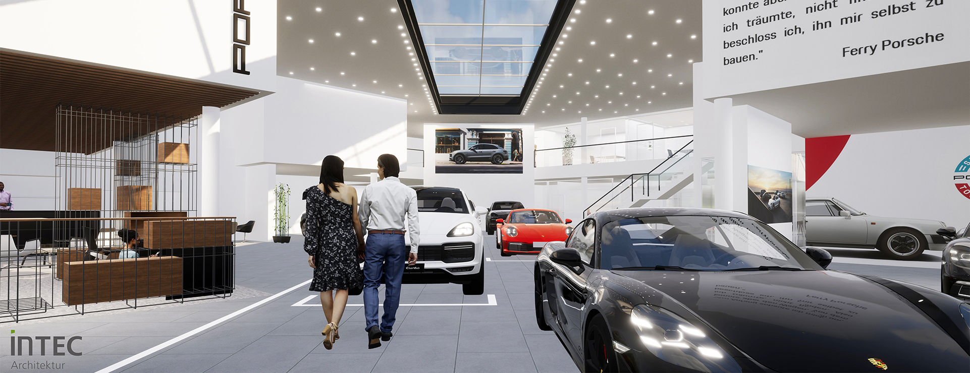 Der erste Umbau dauert voraussichtlich ein ganzes Jahr. Nach Abschluss dieser Arbeiten folgt die Umgestaltung des Showrooms. Der alte Showroom bleibt bestehen und wird zum Ausstellungsraum für Gebrauchtfahrzeuge. Der neue Showroom entsteht nach dem Abriss des vorderen Bereiches (auf der Fläche der jetzigen „alten“ Werkstatt, der Direktannahme und des überdachten Parkplatzes) durch einen Neubau. Um die Ausstellungsflächen zu erweitern, müssen wir leider auf die beliebte überdachte „Durchfahrt“ zwischen den Werkstätten verzichten. Doch dafür erhalten wir einen atemberaubenden Showroom im neuen Design. Dieser wird erstmals zweistöckig sein und neben modernen Büros auch das exklusive „Werk 1“ im Obergeschoss beinhalten. Das „Werk 1“ wird der neue Treffpunkt für unsere Kunden, die sich im Porsche Zentrum gerne etwas länger aufhalten oder sich während ihrer Wartezeit zum Arbeiten zurückziehen wollen.